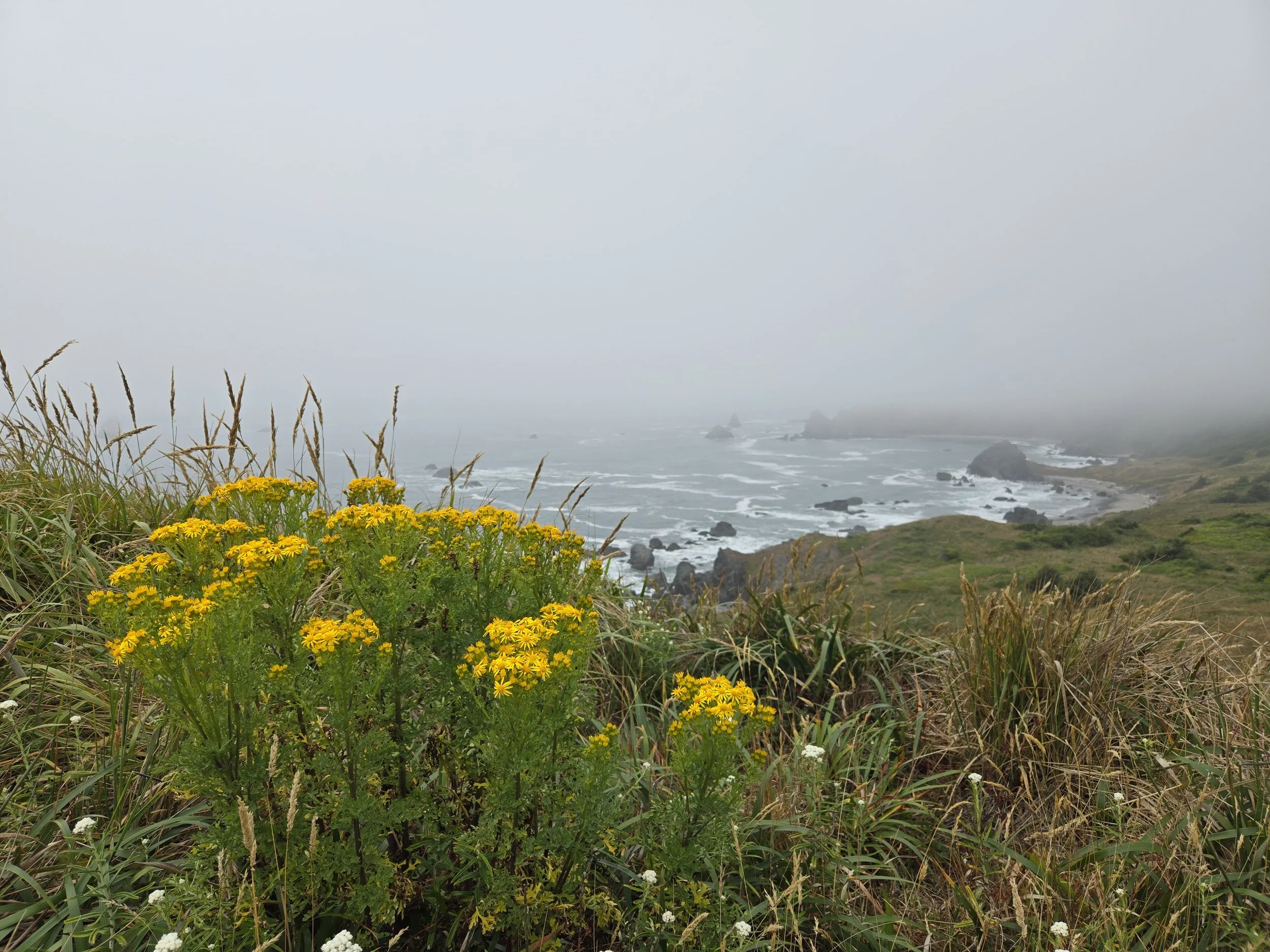 Our next spot was Otter Point State Recreation Site for a half mile walk. This spot is not well known much to our delight because the parking area is small. The trail is easy but narrow and leads to huge sandy cliffs with amazing panoramic ocean views overlooking beaches. When we got here the wind was strong and the breeze was cold, even in July! The area was covered with blooming daises and tall long grasses.