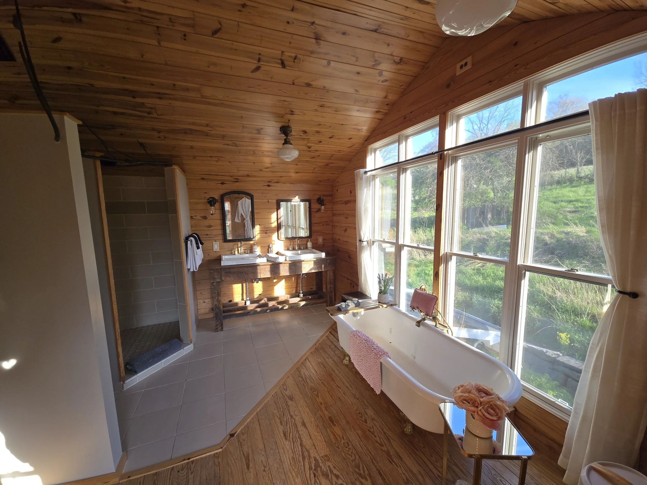 Through a pair of glass-paneled doors, the view stretches out across the hills. A soaking tub waits near the window. A walk-in shower stands ready to rinse away the road. It’s romantic. It’s cozy. It’s the perfect little retreat inside the bigger journey.