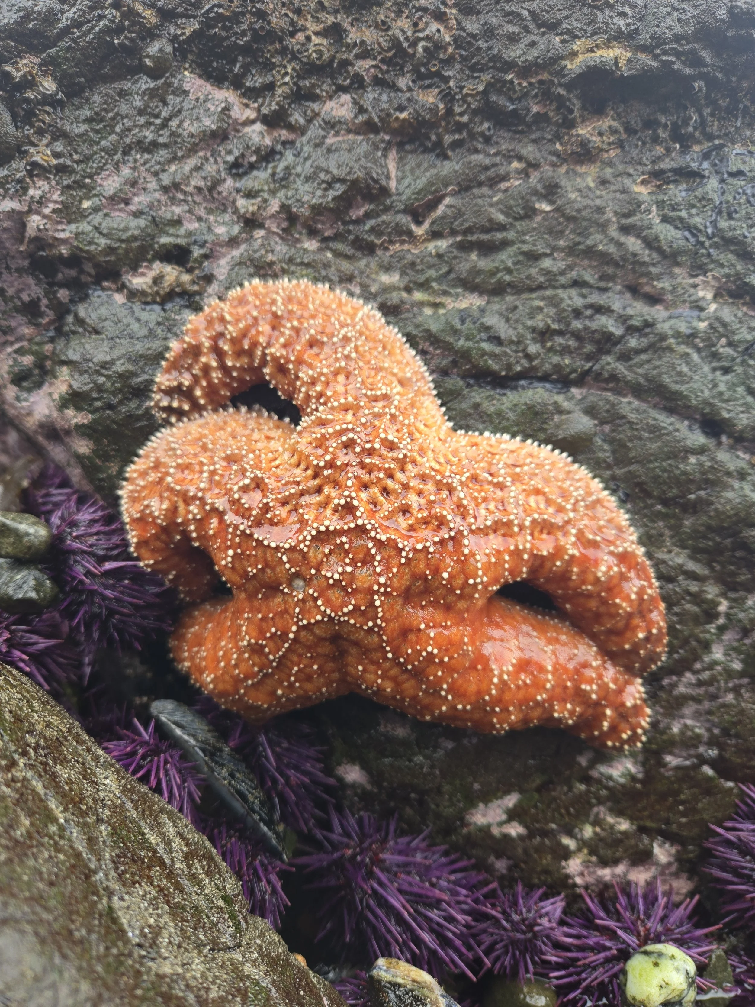 Did you know starfish have thousands of tiny tube feet operating like suction cups to hold them on rocks and to move around the ocean? You might have known that, but what I bet you didn't know is when the Ochre Sea Star eats they push their stomach out through their mouth and into the shell of their prey to digest it- slurping up the meal before pulling their stomach back in… why evolution allowed that to become a thing we’ll have to ask God. Most starfish species also have the unique ability to regrow lost limbs as long as their central body disk remains intact; They have to be from a different planet. They range from purple to bright orange and even some reds and are abundant in the pools. Knowing more about how they devour their prey made me a little uneasy being surrounded by them, despite their beauty. A different common sea star is the bat star, (Asterina miniata) and ranges in color from solid orange, to yellow and even grey. I saw a few of these and one of them was nearly glowing in the water. He was so vivid and orange and just a different shape and texture than the ochre sea star you see everywhere else.