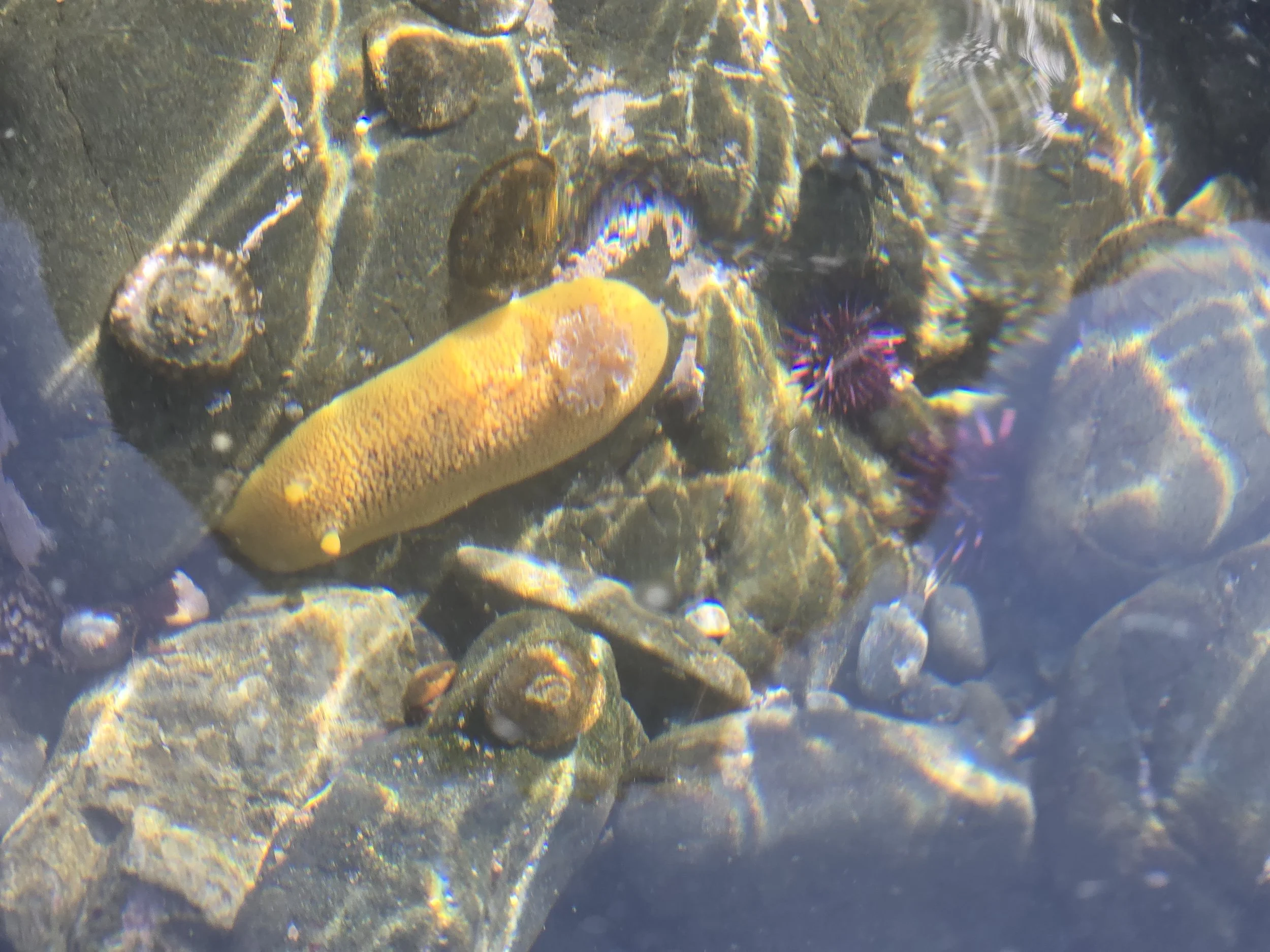 The next thing you'll probably notice is the ground of every pool is moving and there are HUNDREDS of hermit crabs everywhere! Often referred to as “the mobile homeowners” these little guys are always on the move. If it's a shell, I guarantee there is a little crab or snail living inside it. MacKerricher’s tide pools have many hermit crabs ranging from tiny ones in periwinkle shells to larger ones in whelk shells. If you gently pick up a shell and hold it the hermit crab will likely retreat deeply inside, but if you wait patiently and quietly soon you’ll see a cautious antenna or two, then little legs, and out pops the crab! Hermit crabs are omnivorous scavengers or the “clean-up crew” alongside sea cucumbers- which brings me to the next creature that caught my attention for far too long and made me question how much I know about the sea …